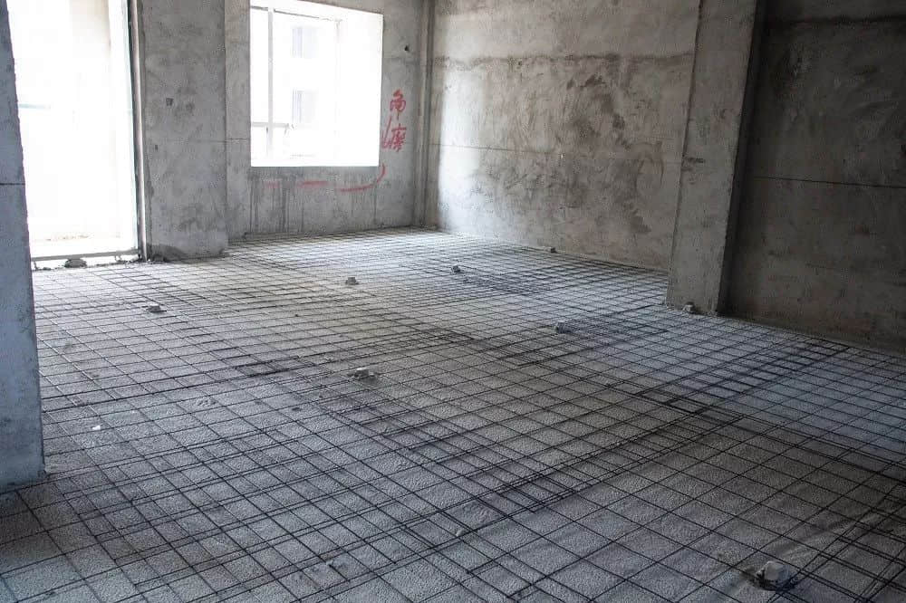 b.其次改性聚丙烯保溫隔聲板鋪設完畢后開始澆筑混凝土(澆筑混凝土保護層時,應及時修正鋼筋網片的位置。墻角處、穿樓板管道處澆筑混凝土時,不得將混凝土澆入豎向隔離片和墻體之間。),混凝土保護層中部應配置鋼筋網片(鋼筋網片應潔凈、無損傷,可在鋼鋼筋網片下面墊上墊塊,確保鋼筋網片置于混凝土保護層的中間位置,鋼筋綁扎時,應避免鐵絲頭刺破HKS改性聚丙烯保溫隔聲板和防水膠帶)。